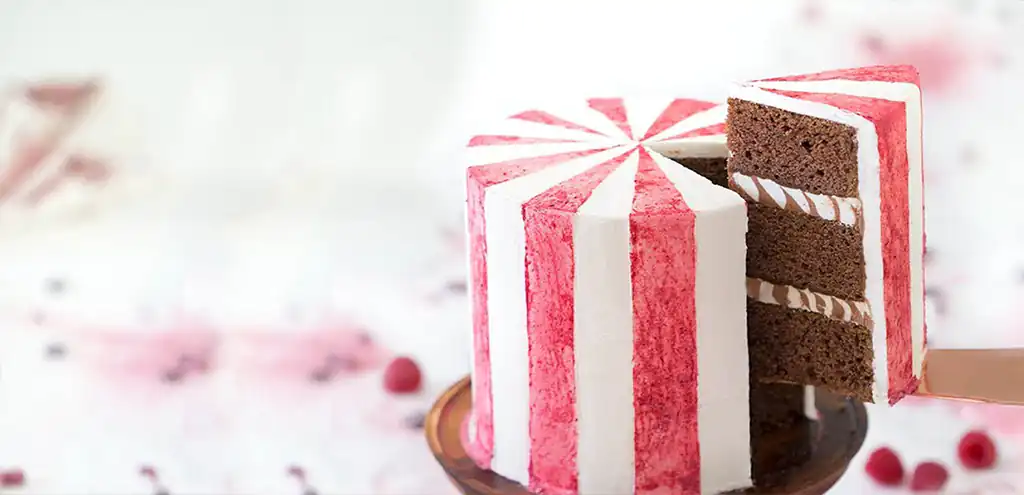 7. Carefully sprinkle the raspberry powder between the stripes, allowing it to settle into the buttercream. Use an air duster or a clean brush to remove any excess powder, ensuring a clean and vibrant appearance.