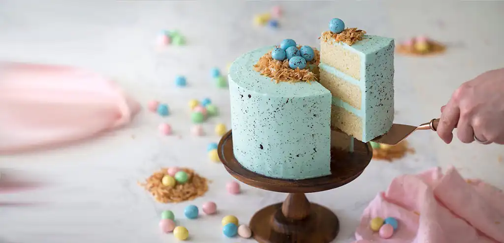 Pipe a buttercream ring on top of the cake, press in the toasted coconut to make a nest, and finally place the chocolate eggs. This recipe yields three six-inch layers. Double the batter for an eight-inch cake and triple the batter for nine-inch layers.
